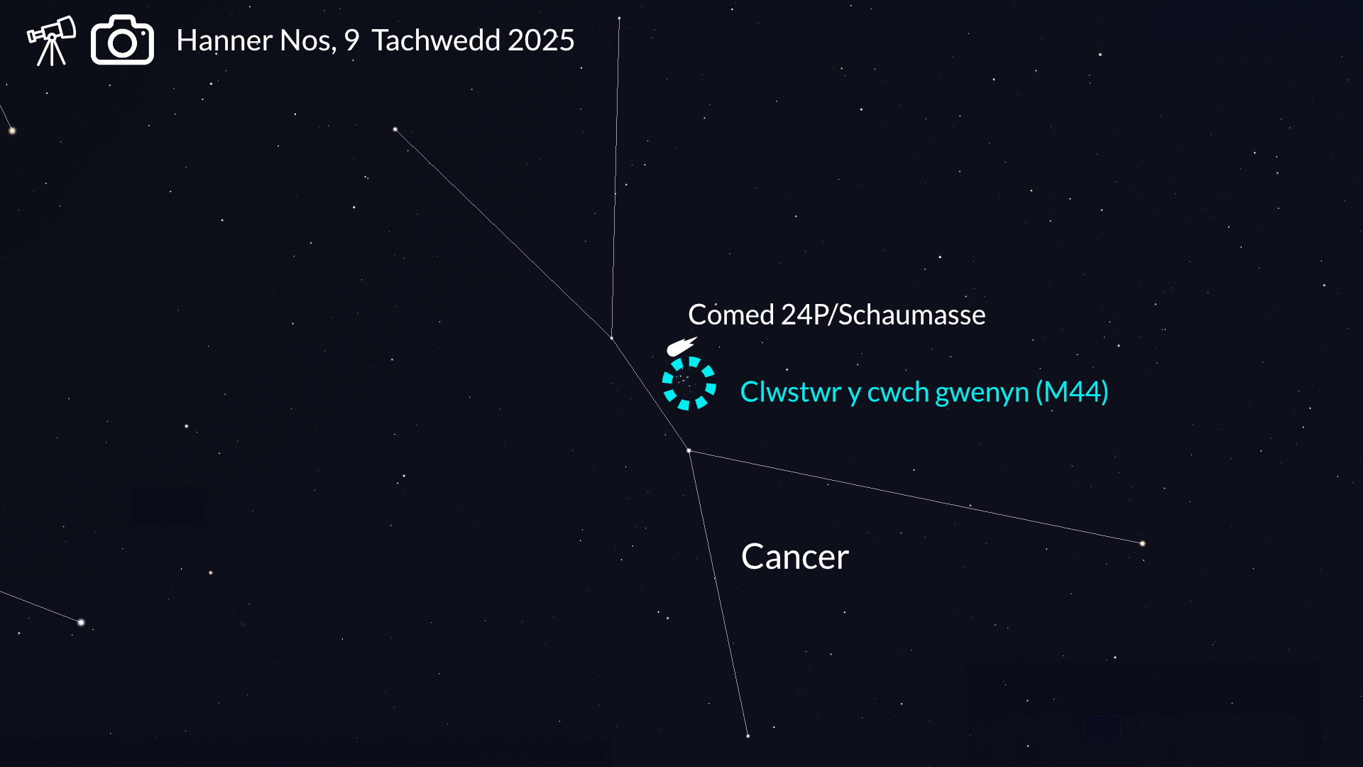 Rhwng 8-11 o Dachwedd, fe fydd Comed 24P/Schaumasse yn pasio dros Glwstwr y Cwch Gwenyn yng nghytser y Cranc.