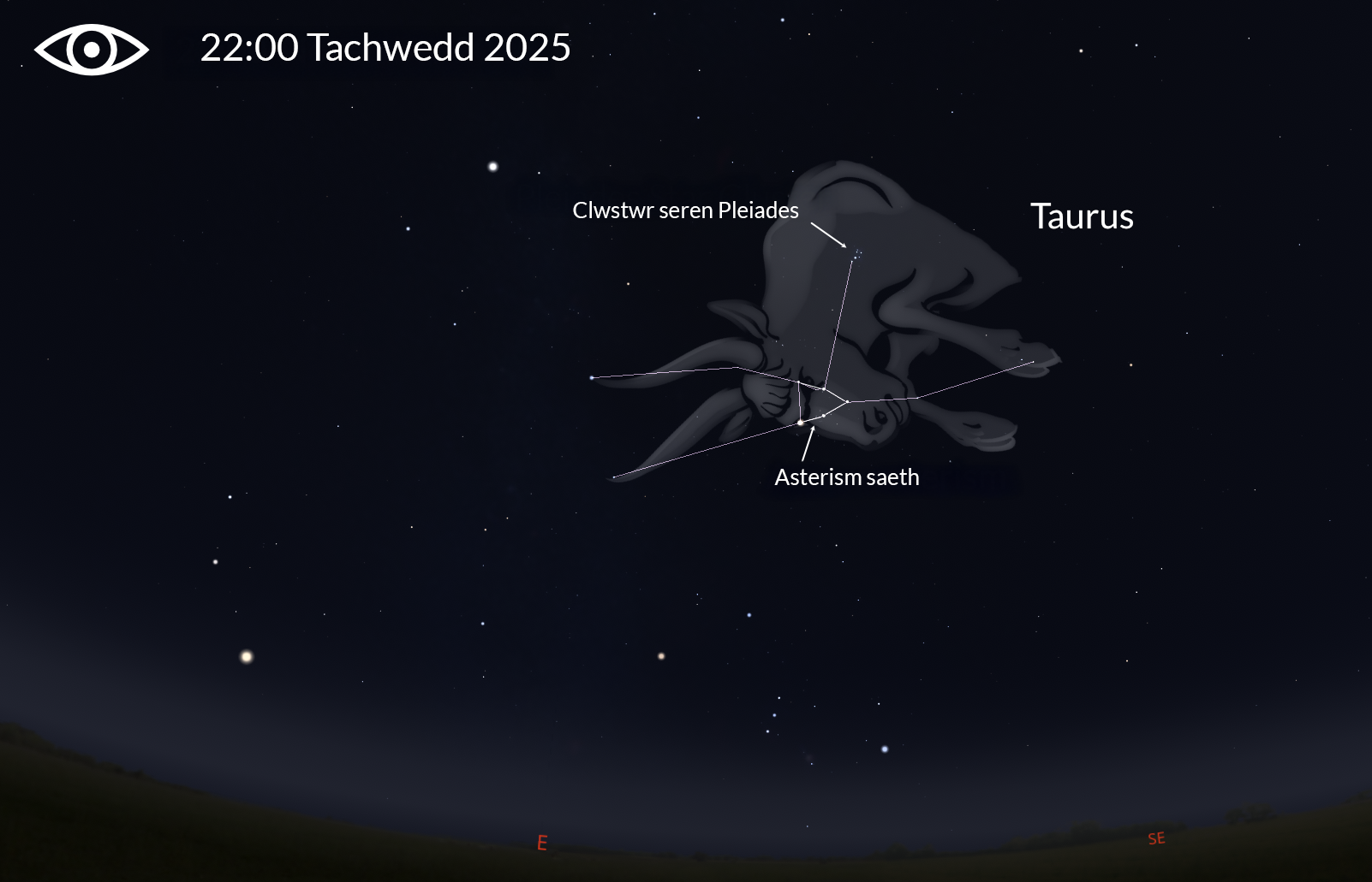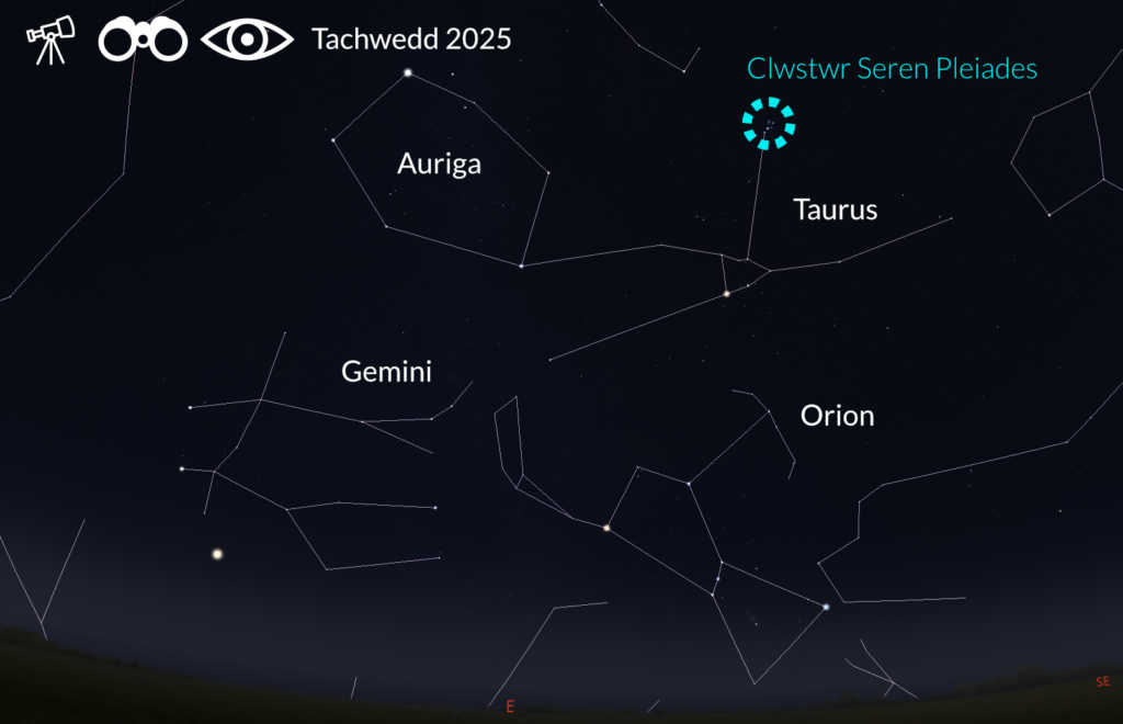 Tra yng nghyffiniau cytser Taurus, defnyddiwch eich ysbienddrych i weld clwstwr sêr syfrdanol o’r enw Clwstwr Seren Pleiades, neu’r Saith Chwiorydd, mae’r nifer gymharol fach, sêr disglair a syfrdanol hyn yn cynnwys 800 yn y clwstwr agored ac wedi’i leoli 410 o flynyddoedd golau o’r Ddaear. Her i’r rhai craff eu golwg yw gweld faint o sêr sydd i’w gweld gyda’r llygad heb gymorth. Oherwydd llygredd golau, gall y mwyafrif o bobl weld chwe seren, hyd yn oed mewn awyr gymharol dywyll. Ond gwelwyd 12 seren mewn awyr eithriadol o dywyll ac mae’n debyg eu bod yn anodd eu gweld yn yr oes fodern hon, yn anffodus oherwydd y cynnydd mewn llygryddion aer a llewyrch awyr