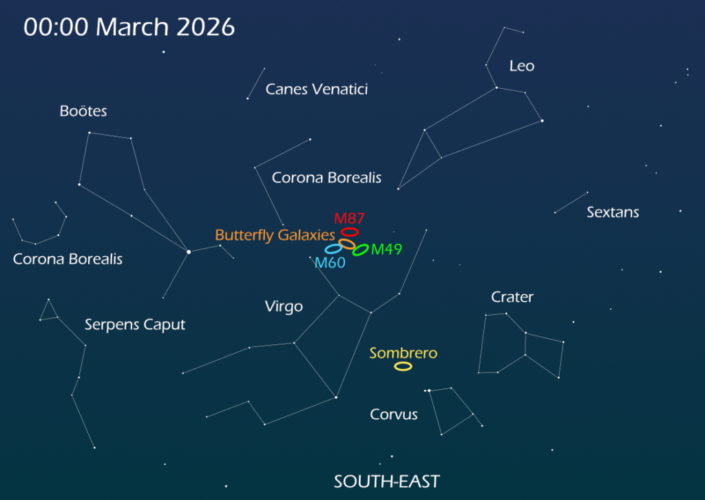 Take the opportunity to feast on the wealth of galaxies that lie around the constellation of Virgo. In dark skies, some of them are even visible through 10×50 binoculars.