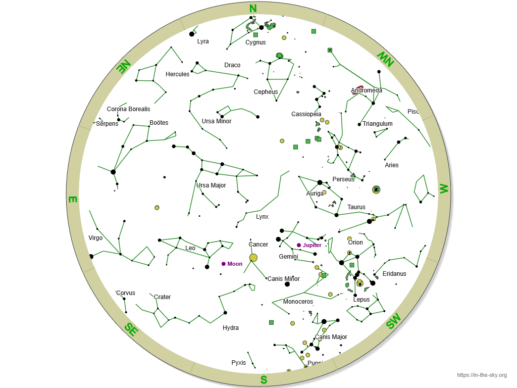 Above the southern horizon, like the constellations of Monoceros, Cancer, Gemini and Leo. The glittering constellations of Orion, Taurus and Auriga moves westwards, whilst galaxy-spangled Virgo rises in the east. Ursa Major reaches the zenith this month. In the north, lie the constellations of Cassiopeia, Cepheus, Andromeda and Draco.