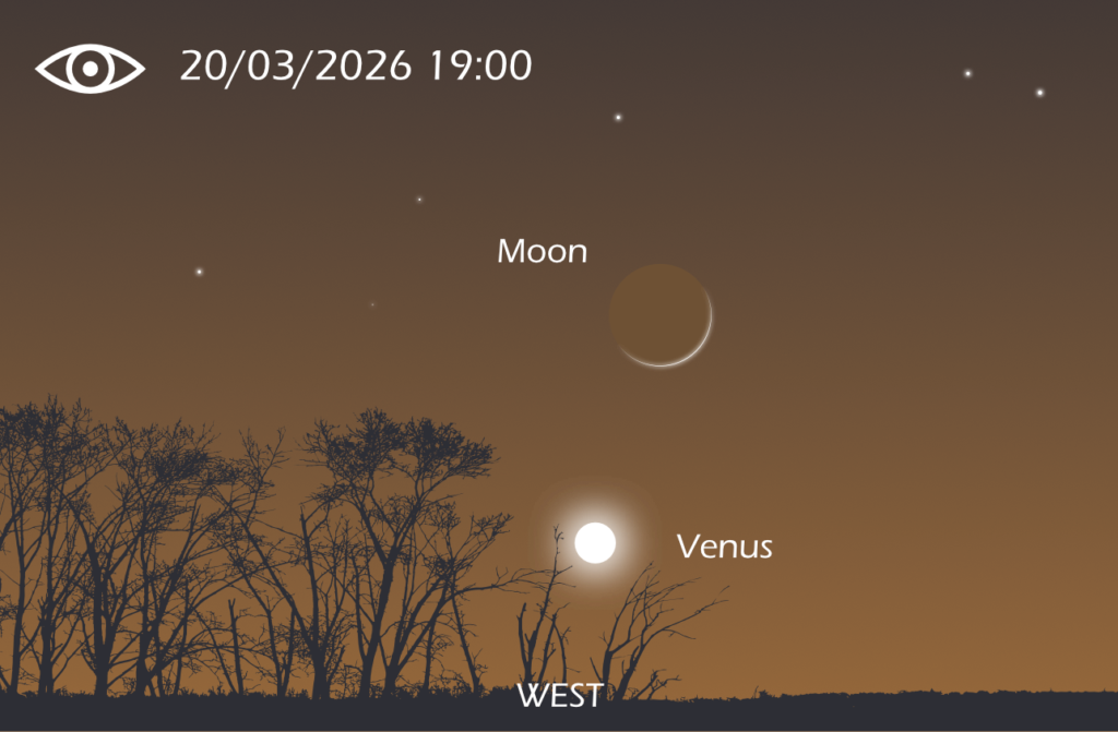 In the second week of March, Venus makes an appearance in the western sky after sunset; you will see a very bright starlike object. On 20th March , look out for a pretty conjunction of Venus and a tiny sliver of the 2-day-old Moon in its very early phase in the western sky after sunset.