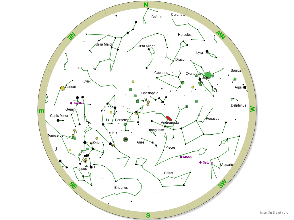 Low on the southern horizon, you will see the constellation of Cetus. Higher up above the south, lie the constellations of Aries, Triangulum, Perseus and Cassiopeia. Westwards, the constellations of Andromeda and Pegasus are still well-placed, whilst the summer constellations of Cygnus, Lyra and Delphinus set in the west.