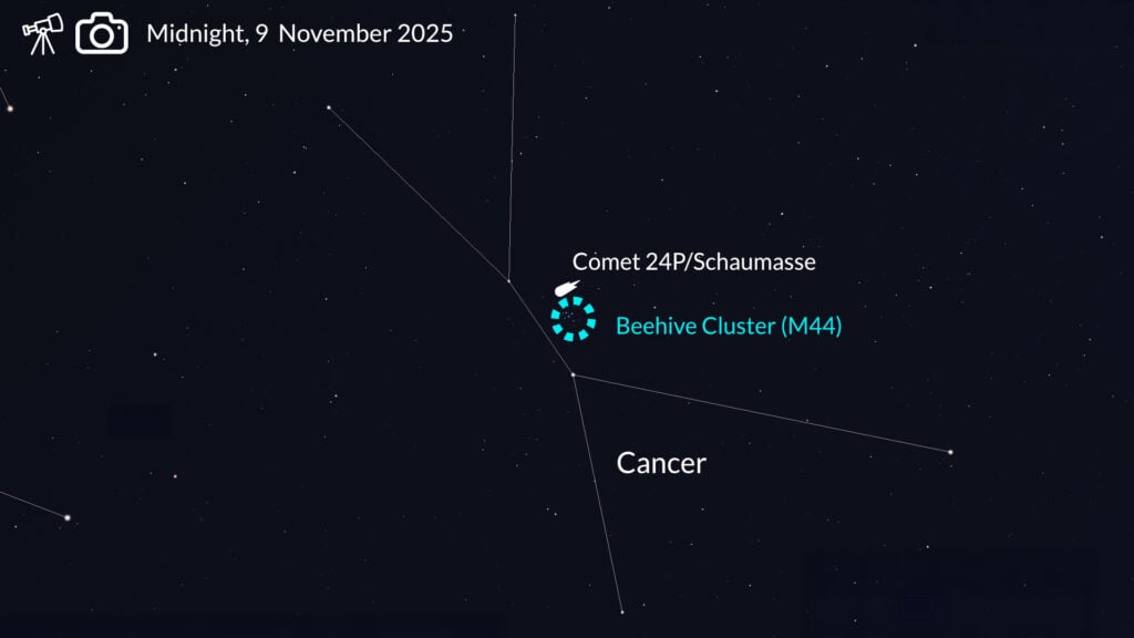 Between 8-11 November, Comet 24P/Schaumasse will pass over the Beehive Cluster in the constellation of Cancer.