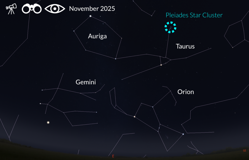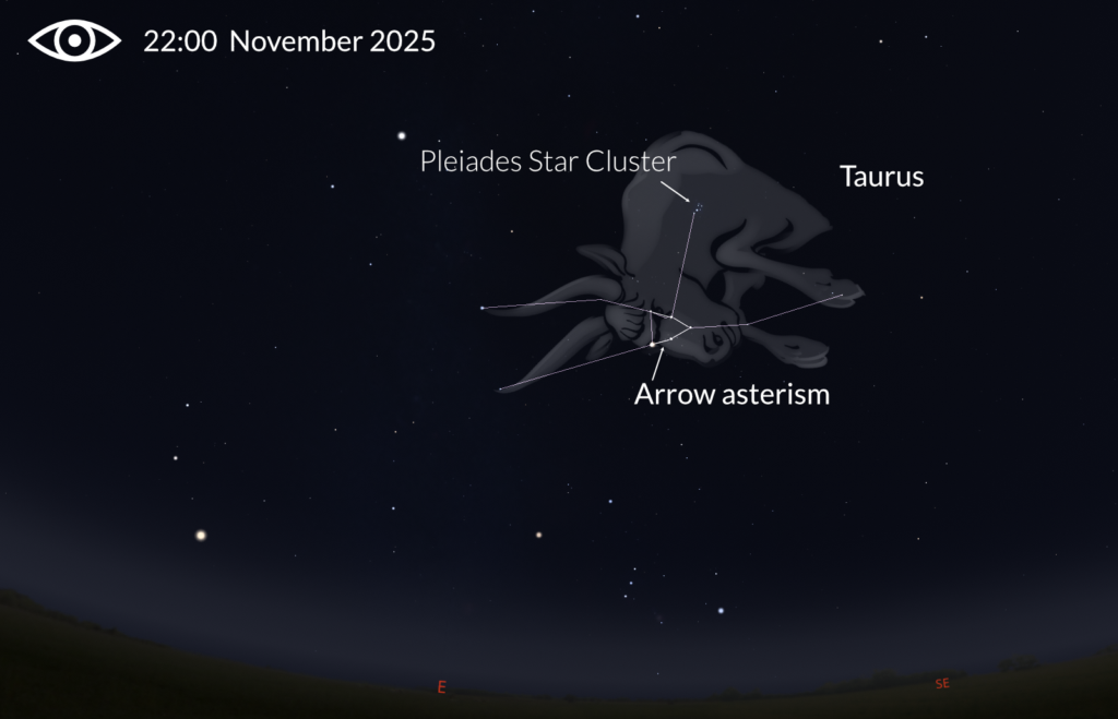 The constellation of Taurus the Bull is well-placed during the month of November and can be seen above the the south-eastern horizon, identified by the Pleiades Star Cluster and the arrow asterism.